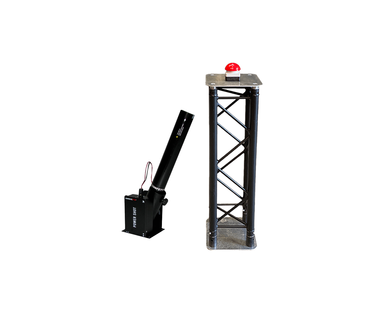 In deze set zit een rode lanceerknop, die je neer kunt zetten op de truss paal. De knop zal verbonden zijn aan de confetti shooter, waardoor je met een druk op de knop de confetti de lucht in kunt schieten! De bekabeling voor het aansluiten van de apparatuur zit bij deze set inbegrepen.